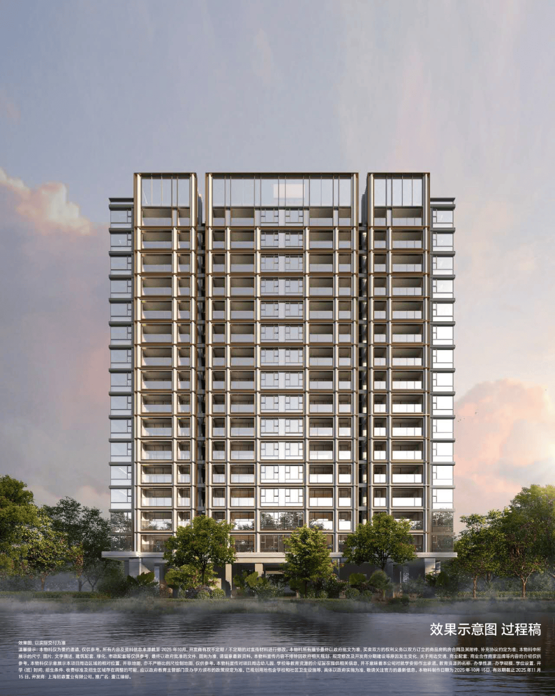 材质:局部温润石材、仿铜铝板、仿石铝板及局部仿石涂料,竖向铝板提升品质感