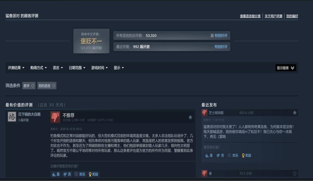 然而在销量与在线人数屡创佳绩的同时,《猛兽派对》却面临着各种差评困扰。在Steam平台,《猛兽派对》整体评价等级为“褒贬不一”。而两年后的今天,再看《猛兽派对》的在线人数,数据仅维持在巅峰时期的十分之一左右(根据小黑盒数据,2026年1月其平均在线)。