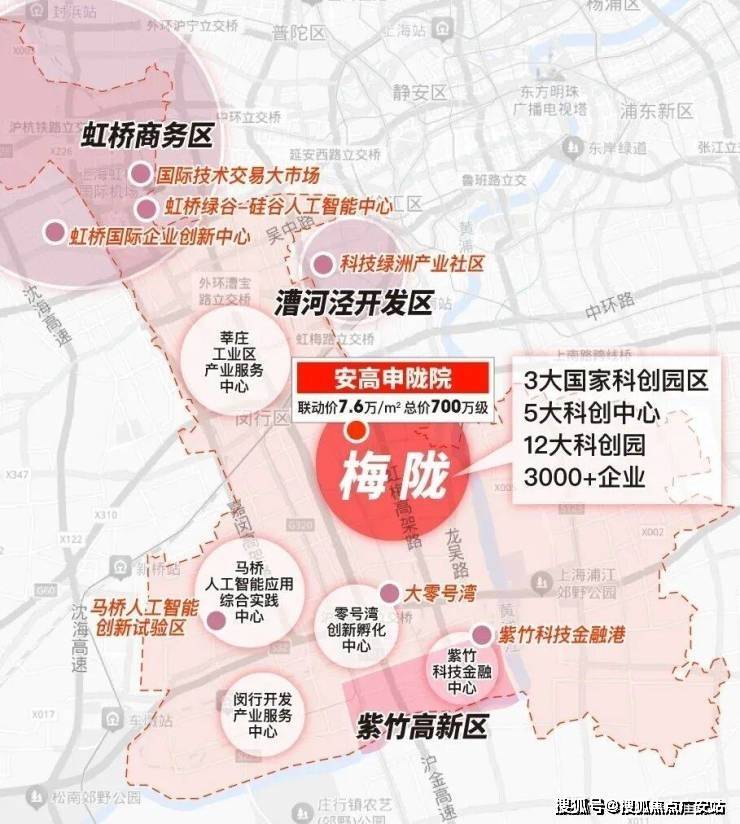 梅陇周边有3大国家级产业区、5大科创中心、12大科创园、3000+企业,直线公里范围内拥有漕河泾开发区、紫竹高新技术产业园等科创基地。据悉,漕河泾开发区有望入住梅陇,为增强闵行中部地区科技创新活力。