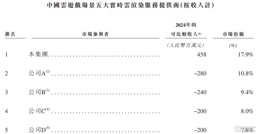 根据灼识咨询的资料,按2024年的收入计算,海马云在中国云游戏场景实时云渲染服务提供商中排名第一,市场份额为17.9%。