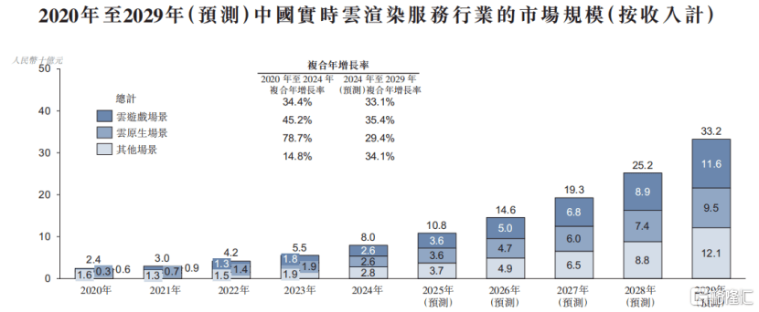 实时云渲染服务市场仍处于相对早期的发展阶段。根据灼识咨询的数据,全球实时云渲染服务市场规模从2020年的110亿元增至2024年的297亿元,预计到2029年将达到870亿元。
