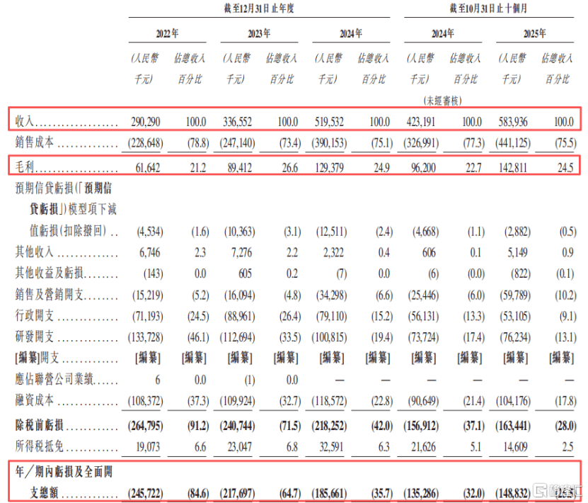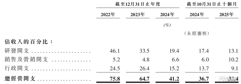 具体而言,公司研发开支占总收入的百分比由2022年的46.1%大幅降至2024年的19.4%,并进一步下降至2025年1-10月的13.1%。